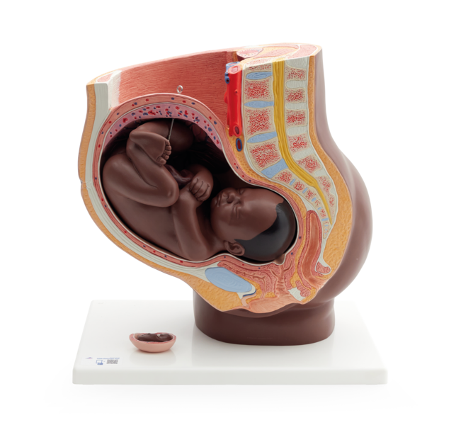 Pregnancy Pelvis Model in Median Section with Removable Fetus (40 weeks), 3 part, dark skin –