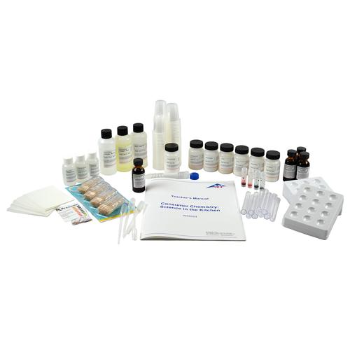 This comprehensive kit incorporates a variety of scientific techniques all themed around common kitchen materials. Students will perform chromatography on commercial food colors, use chemical tests to identify an unknown cooking ingredient, examine the protein digesting ability of a common meat tenderizing enzyme, use titration to quantify vitamin C levels and then test an unknown juice or soda (not provided), and lastly examine some of the differences and similarities in the materials used to clean up (soap, hand dishwashing detergent, and machine dishwashing detergent). Kit contains enough materials for fifteen groups. Teacher’s Manual and Student Study Guide copymasters are included