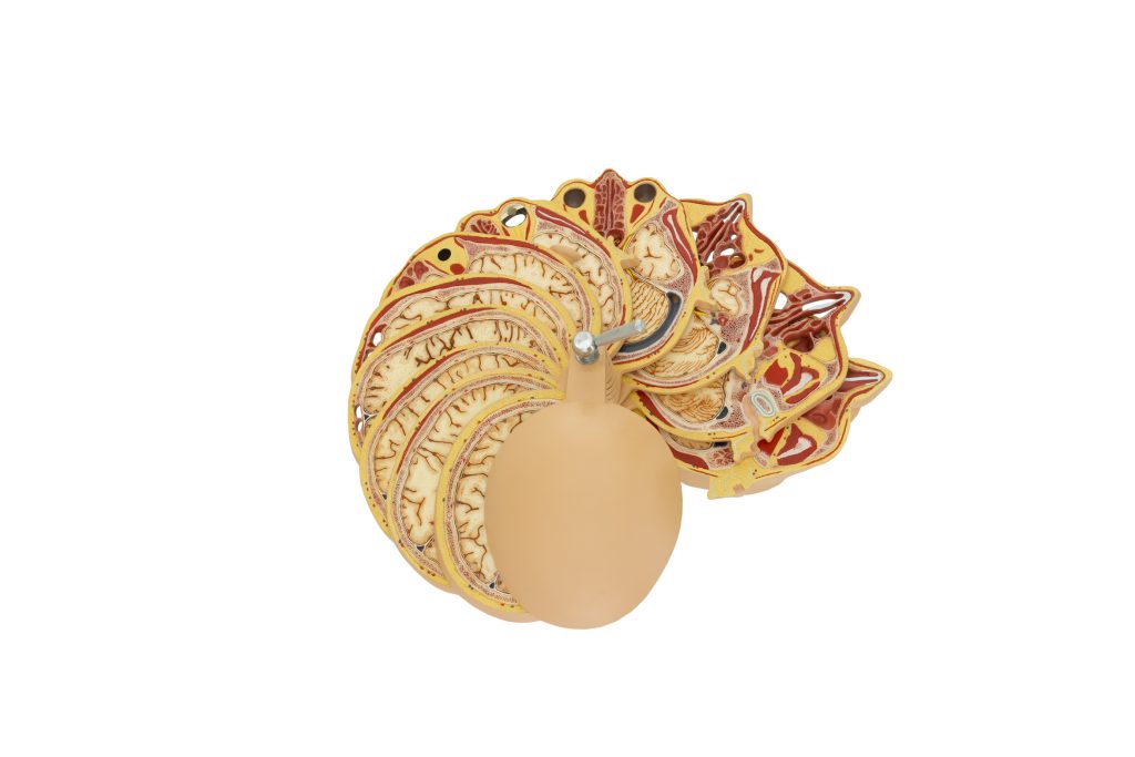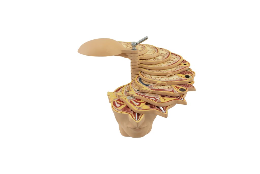 This life-sized model is crafted from specialized plastic. It includes 10 sequential anatomical sections meticulously designed for compatibility with horizontal CT and MR imaging, each measuring 0.8 cm thick. These sections are vertically attached to a rod, enabling easy movement and rotation for convenient comparison and examination in conjunction with corresponding CT and MR images. The model includes an informative booklet and is securely mounted on a base.