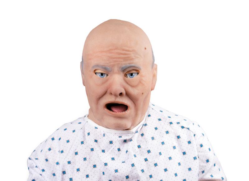 This head cover can simply be pulled over the head of the Nursing Anne / Diana nursing doll and transforms the normal nursing doll into a doll with a geriatric appearance. The soft skin looks lifelike and feels realistic. The mouth, nose, ears and tracheostomy opening are accessible so that the doll‘s functions are fully preserved. The mask has a zipper on the back of the head so that it can be attached and removed without much effort.