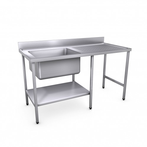 A single large bowl – single draining board, stainless steel sink unit with frame and undershelf and a void for a dishwasher or bin. This unit is supplied fully constructed (welded) with 30mm stainless steel box tubing and adjustable feet. This sink is pre drilled for taps and a waste fitting.
