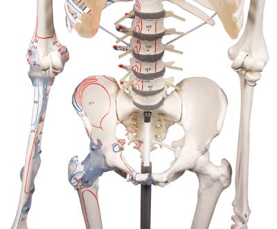 This therapy skeleton offers marking of the muscle origins and insertion points on one body side in addition to the moveable vertebral column and muscle marking.