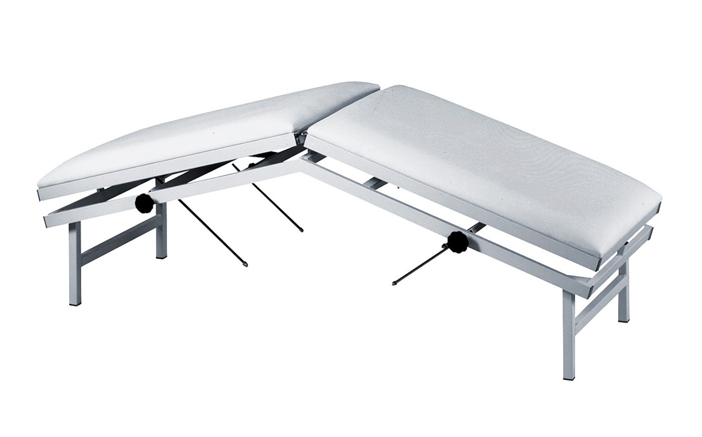 On the sonography table , both 64 mm-thick upholstered tabletop sections can be adjusted continuously with gas pressure springs and secured using the black handles (-17°/+15°).