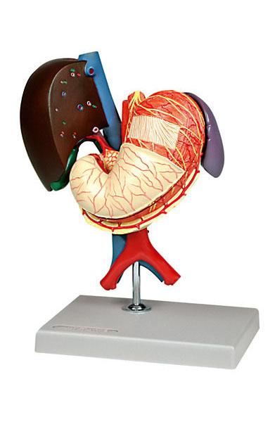 This life size model has the following features, 2-part stomach along with the pancreas, spleen and duodenum (shown in open section), gallbladder with bile ducts, abdominal aorta, vena cava, mesenteric and iliac vessels. 2 sections of the liver-gallbladder are interchangeable.