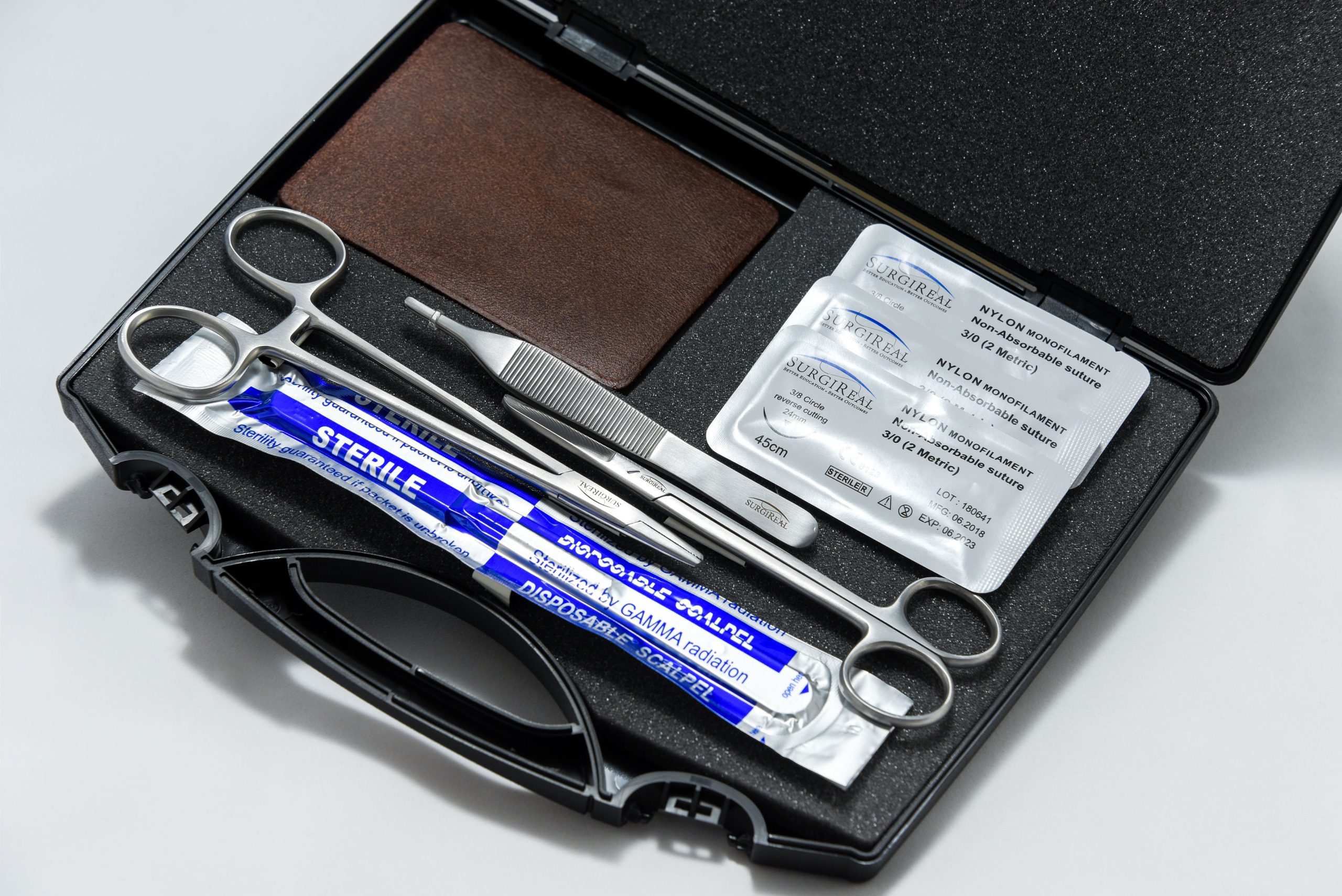 SurgiReal’s Suture Training Kit combines a dark skin suture pad with a set of suturing instruments and three packages of non-sterile 4-0 practice suture. Instruments included in the kit: 1 Disposable No. 10 Scalpel, 1 Adson Tissue Forceps (1×2), 1 Stich Scissor, 1 Mayo Hegar Needle Holder 6”