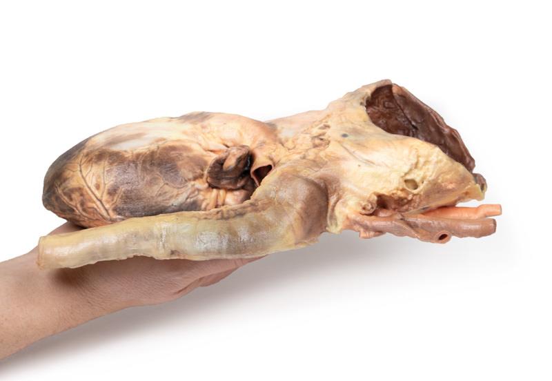 This specimen is the patient‘s enlarged heart, including the aortic arch and descending aorta. The ascending aorta is dilated up to 7 cm in diameter, and is expanded superiorly by a large aneurysmal bulge 11 x 13 cm in diameter. This has been opened to display the wrinkled scarred intimal surface. There is also marked atheroma of the intima. The innominate, left common carotid and subclavian arteries have been displaced towards the patients left by the aneurysm. On the internal surface of the aneurysm there is a ridge-like thickening 5 mm high. This is the site of attachment of the pericardial sac externally. There is marked congestion of small blood vessels in the adventitia of the aorta. This is a syphilitic aneurysm of the arch of the aorta.
