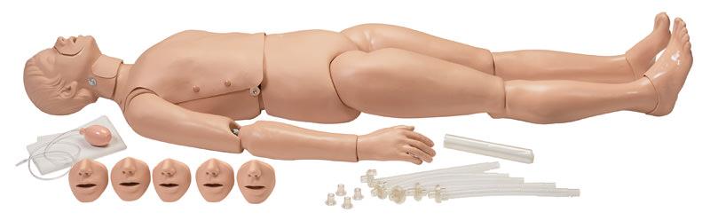 This 165 cm tall, full body and foam-filled lightweight manikin has joint mobility for easy positioning in all types of environments Its standard features include a carotid pulse driven with a squeeze bulb, our patented ball valve airway system, removable face pieces for ease in controlling crosscontamination, and anatomical landmarks for determining proper hand position for ompressions. Five lung systems and five face pieces are included. The options available include moulage kits, a transport rescue head (to preserve the CPR head during rugged rescue training) and an optional lower IV arm.