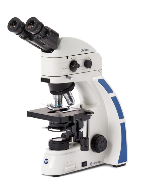 The Oxion microscopes for fluorescence are equipped with an epi-illumination with a 100 W mercury vapor lamp. The fluorescence attachment have a rail for maximum 4 filter cubes. The FluoLed model is equipped with a 455 nm LED and one filter cube, especially developed for efficient and fast detection of tuberculosis by the Auramine-O fluorochrome. Other FluoLED wavelengths are also available