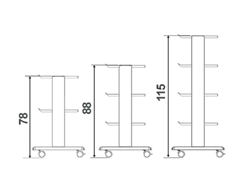 Carts with base and 2, 3, or 4 wide, sturdy shelves in 3 different widths 40, 50 or 60 cm.