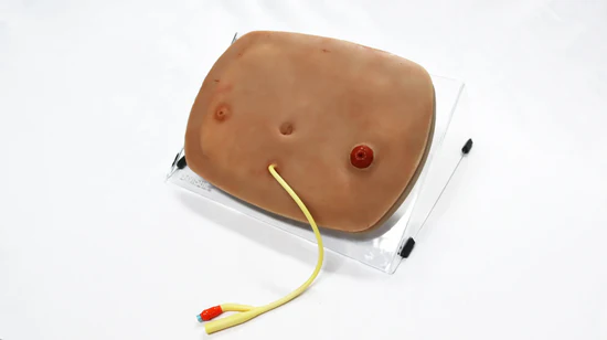 The SYM Abdominal Multi-Task Trainer is a lifelike and durable model specifically developed for training in subcutaneous injection, colostomy and ostomy care, suprapubic catheterization, post–laparoscopic cholecystectomy scar management, and jejunostomy feeding tube procedures.