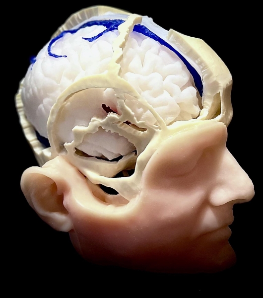 Human skull with all the craniometric points, fissures and canals. 1:1 scaled from a real human CT scan on a with similar drilling properties to thehuman bone. Includes the skin, intracranial dura, falx, tentorium, venous sinuses and all cranial nerves, arteries as well as the brain, cerebellum and brainstem. Pathology: olfactory groove meningioma, sphenoid wing meningioma, parafalcine meningioma, trigeminal schwannoma, and a vestibular schwannoma. All extracted from real cases and including the DICOM images for the preoperative planning.