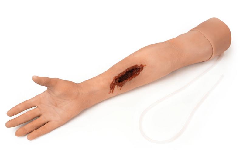 The trainer represents a lacerated wound of the arm. The bleeding system enables the trainer to bleed realistically from the wounds.