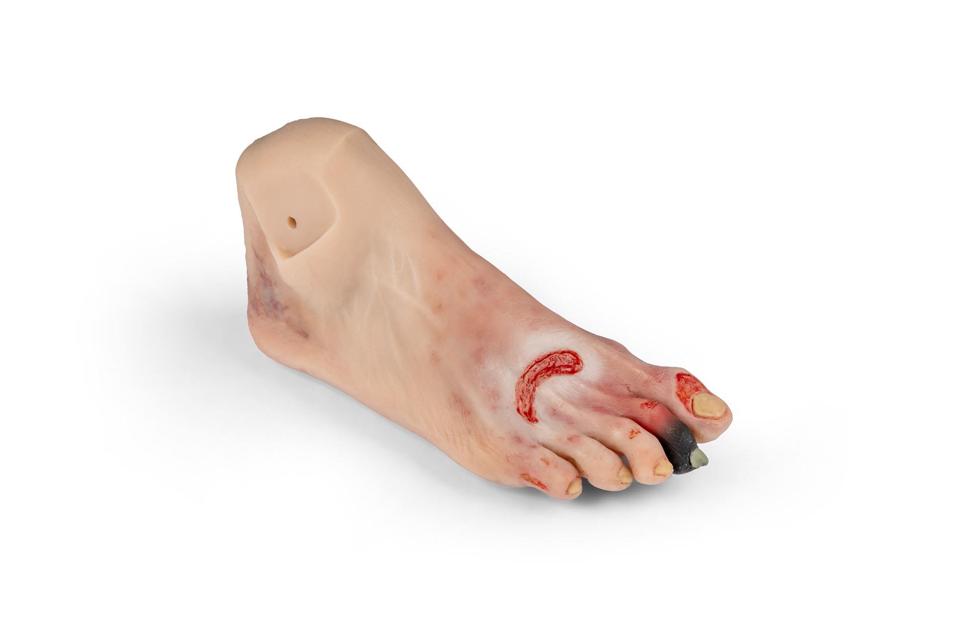 This life-like and life-size foot model shows typical symptoms of the diabetic foot syndrome. Multiple ulcera and lesions are located at typical positions in different grades. Additional symptoms like cracked skin and a necrotic toe are also shown. A perfect model for diabetic education as well as for nursing education or medical studies. Especially suitable for wound care management education.