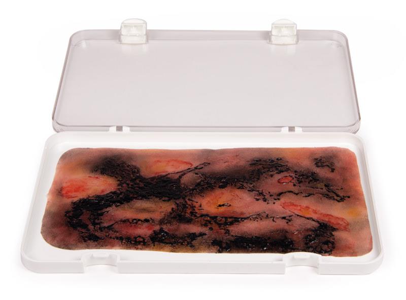 This moulage shows a 3rd degree burn with burned skin layer. The moulage adheres to skin or a manikin. For longer training or improved adherence optional glue is available.