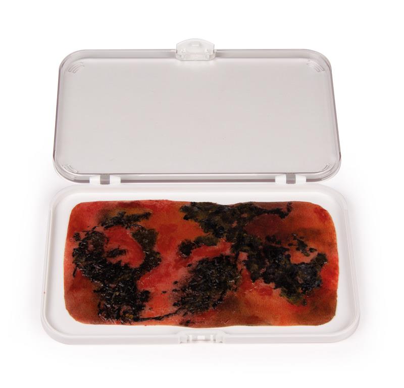 This wound moulage shows a 3rd degree burn with burned skin layer. The moulage adheres to skin or a manikin. For longer training or improved adernece an optional glue is available.